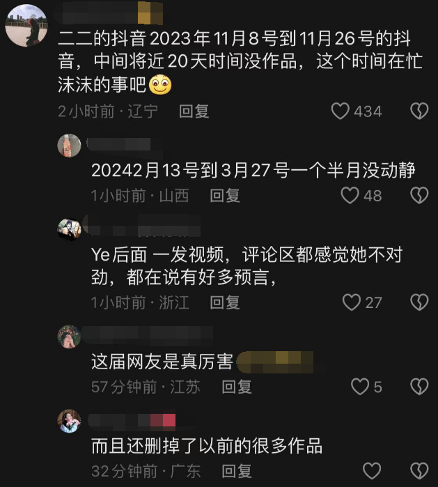 另外,深扒小杨哥老婆的账号,发现她在去年11月8日到11月26日断更了将近20天,之后2月13日到3月27日断更,一个半月没发动态。而后就一直发视频,也把之前的一些作品删除了,这些举动都让人觉得有些反常。