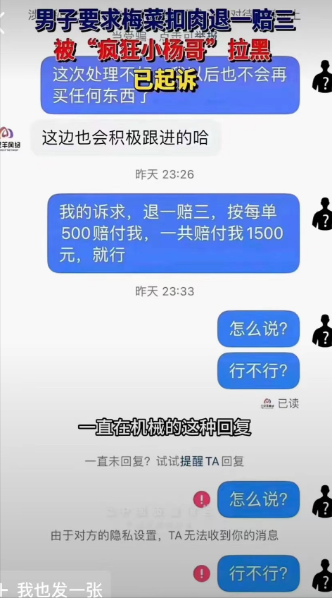 还有网友爆料,他要求梅菜扣肉退一赔三,结果被小杨哥给拉黑。而辛巴的1亿已到账,小杨哥如果不处理,难不成辛巴真成了售后?