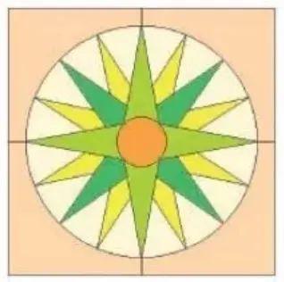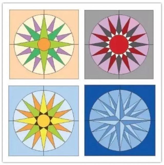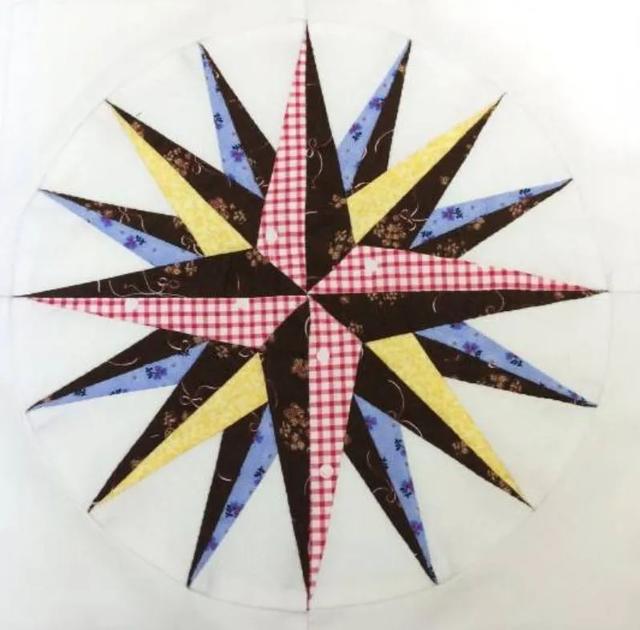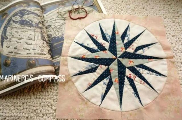 这个图谱的由来,最早要追溯到十七世纪了。那个时候,有大量的欧洲移民经由陆路或者水路去探索新的世界。而罗盘针就是他们最重要的向导。最终,罗盘针的形象成为了拼布的图谱,也许是为了纪念那一路的艰辛,也许是象征着可以指引方向的那片光明,这个图谱也应运而生。
