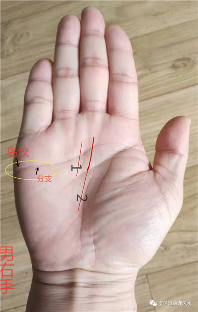 右手伸开,玉柱纹两条被称为双重玉柱纹,说明福主进入中年以后,事业财运方面会获得很好的一个向上的发展方向、财运会更加丰隆。天纹感情线上又出现明显的岛纹和分支,说明婚后夫妻之间情感方面容易于一种意见不合或者分居的一种倾向。