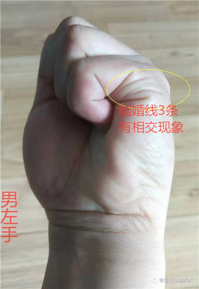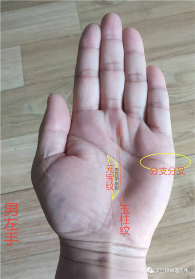 玉柱纹与人纹智慧线、地纹生命线以及辅线构成了一个比较明显的元宝纹,手有元宝纹的人具有很强的理财和聚财能力。元宝纹越明显越大越封闭,对事业发展越有很大的帮扶作用。天纹感情线深长明了清晰,比较重情重义;天纹感情线底端分支分叉比较明显,出现这种状况,婚姻方面出现一些容易出现波折起伏或者夫妻不和。实际上福主晚婚,婚后夫妻之间异地工作,长时间聚少离多。目前福主一直处于一种分居状况,处于这种长时间的分居现象福主与妻子处于离婚的边缘。看其后运,婚姻方面还是以谦和为妙。