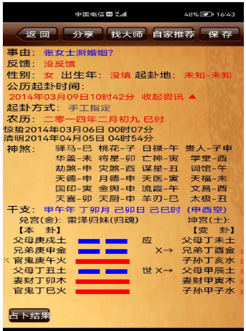 我们看第二个案例,甲午 丁卯 己卯日张女测婚姻,摇得雷泽归妹变泽天夬。女测婚姻,以内卦官鬼为用神,兼看应爻配偶宫。内卦财官临旺地相生,世应临父母爻不弱,说明还没有离婚。