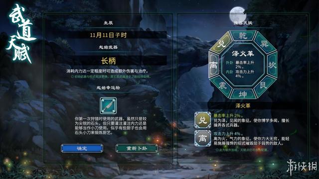 作为一款武侠游戏,战斗系统自然是必须要聊的。本作在继承前作战斗系统的基础上又进行了大幅度的创新改良。前作养成机制之一的八卦系统在本作中焕然一新,八种卦象对应了不同的强化属性,每个卦象都有自己独立的一套天赋树,这一改动让八卦加点自由度显著提升,玩家可以根据自己战斗需求以及风格偏好进行加点。