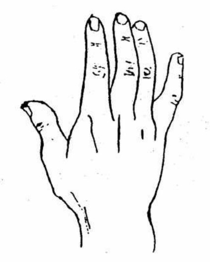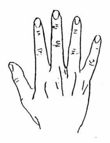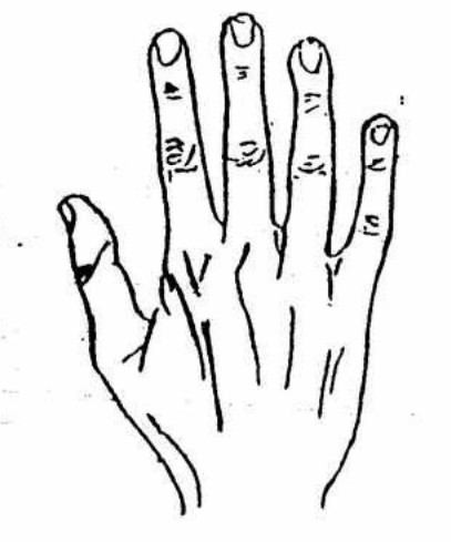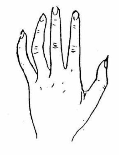 上图手形外状为原始人的手形,读者在鉴定自己手形的时候应做这种伸张状与镜对照,凡类似这种手形者,谓之原始手形,有这种手形的人,性格直,傻,知足常乐,不善用心机,性情粗野,急躁智慧较为迟顿,这种人或务农,或为武或以猎为生者居多。