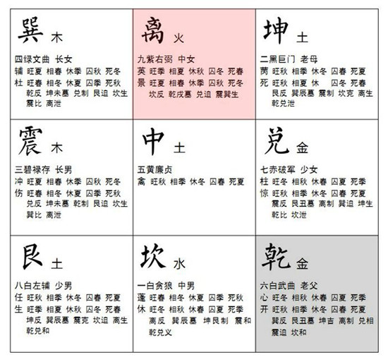 九紫星,为右弼星,五行属火,代表火、喜庆、中女、智慧、眼睛、血液。
