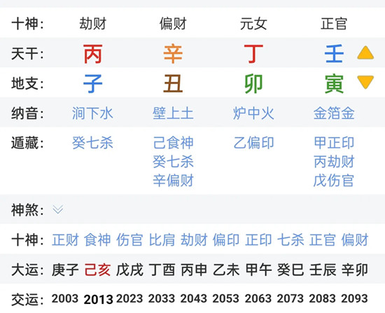 36-45走丁酉大运,天干丁火帮身,事业财运会向好的方面发展。地支酉金与夫妻宫有卯相冲,有婚姻动荡不安之象,夫妻间要多交流沟通,注意感情培养。