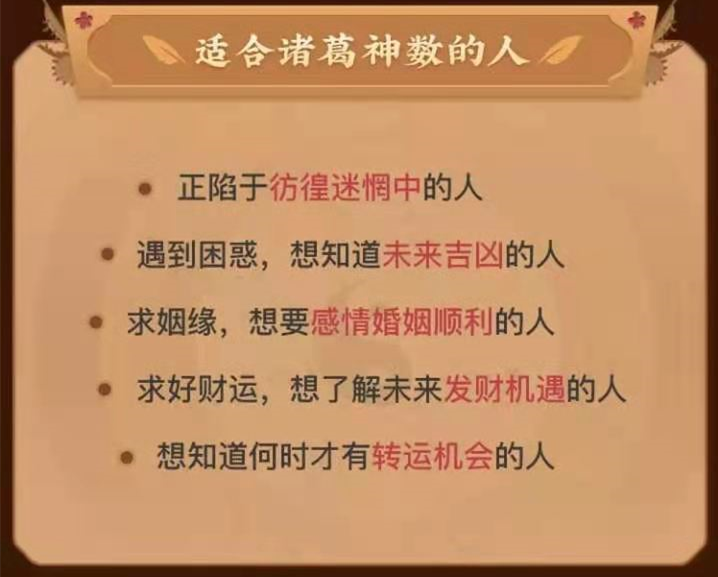 所以万万不可存“玩一玩”的心态。诸葛神数,共三百八十四爻,谶语句法,长短不一,寓意深远,对占卜者的思路,有很大的启发作用,特别是那些正陷于彷徨迷惘中的人,更有一种拨开云雾,重见天日的豁然开朗感觉。因此这是可以作为判断吉凶,决定进退,是选择趋吉避凶的指南针。仔细解读更有拨开云雾,重见天日的豁然开朗感觉。